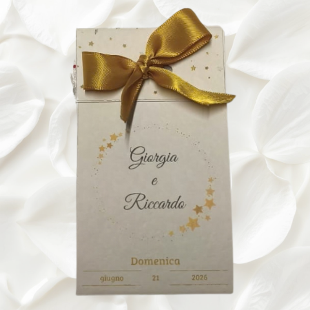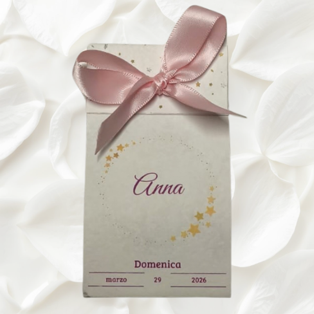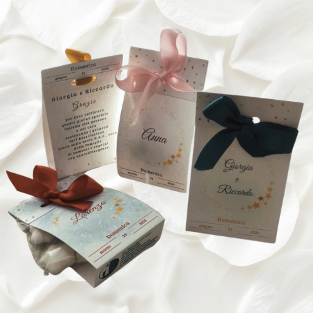 La bomboniera - Elegante cartoncino con nastro in tonalità coordinate al tema dell’evento; all’interno 5 confetti a forma di stella in cioccolato. Ogni bomboniera è personalizzata con i nomi e la data, richiamando la “Stella” dell’occasione.